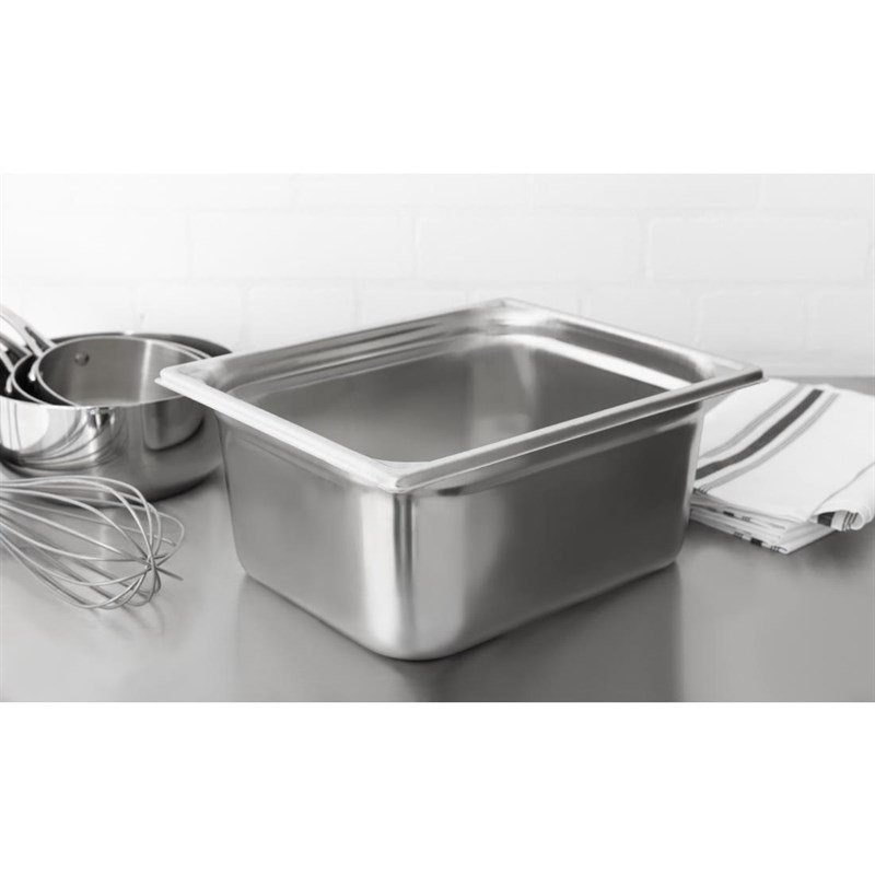 Topkwaliteit RVS Gastronorm bak. De versterkte randen voorkomen dat de bak beschadigt en zorgen dat de bak lang meegaat. Voldoet aan Europese norm EN631.