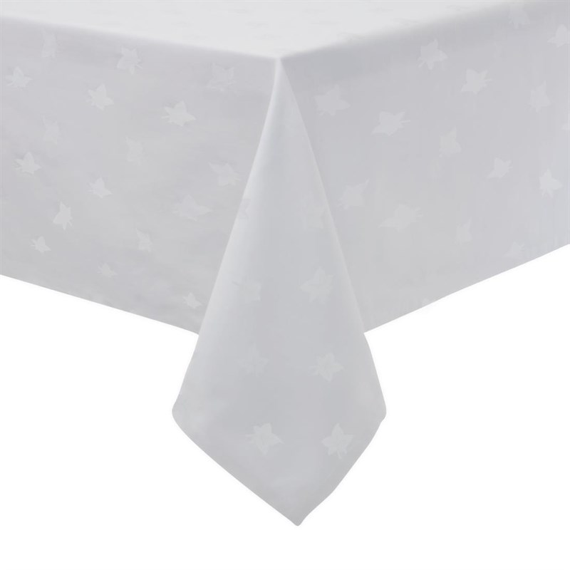 Tafelkleed van wit Egyptisch katoendamast met aantrekkelijk klimopbladmotief. Het katoen is gemerceriseerd en daardoor extra sterk. Gewicht: 190g/m². Materiaal: 100% katoendamast. Draaddichtheid: 135. Garendikte: 30/2 16/1. Kleur: wit.