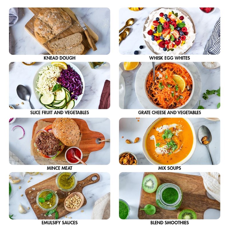 Mixen, raspen, hakken en kloppen is eenvoudig dankzij de krachtige, robuuste motor van 950 W die zelfs bij grote hoeveelheden ingrediënten snel werkt. Elk van de drie vaatwasmachinebestendige kommen biedt grote flexibiliteit, inclusief de grote kom van 3 liter, die plaats biedt aan grote of volumineuze ingrediënten.