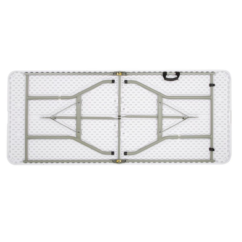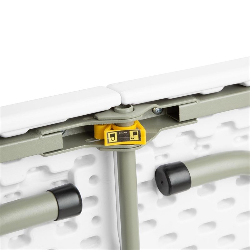 Met een blad van hogedichtheidspolyethyleen (HDPE) en stalen poten is deze rechthoekige tafel ontworpen voor langdurige duurzaamheid. Het opvouwbare, lichtgewicht ontwerp en de geïntegreerde draaggreep maken het voor medewerkers eenvoudig om de tafel op te zetten, in te klappen, te vervoeren en op te bergen. De voetdoppen helpen beweging tijdens gebruik te voorkomen en beschermen vloeren tegen onbedoelde krassen en schrammen.