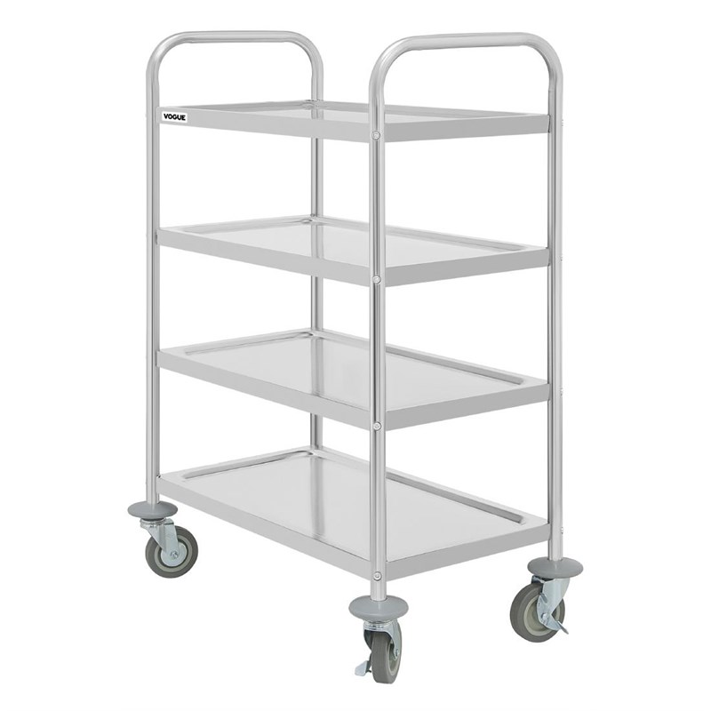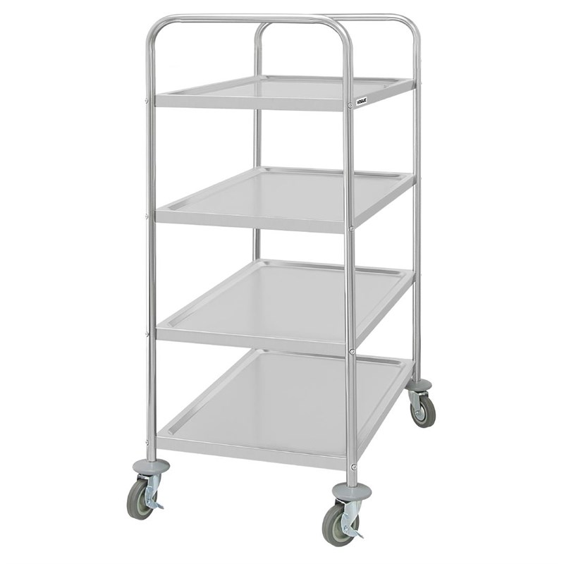 Deze grote Vogue afruimwagen met 4 niveaus is sterk en duurzaam, en is een uitstekende oplossing voor het vervoeren van artikelen tussen verschillende ruimtes. De wagen is volledig gemaakt van RVS, eenvoudig te reinigen en onderhouden, en biedt een hygiënische basis voor het vervoeren van artikelen, zoals bestek, opgemaakte borden, drankendispensers, linnen of schoonmaakmiddelen.