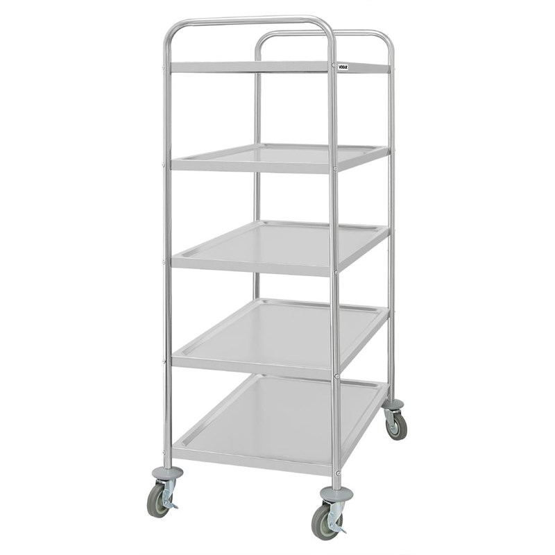 Deze grote Vogue afruimwagen met 5 niveaus is sterk en duurzaam, en is een uitstekende oplossing voor het vervoeren van artikelen tussen verschillende ruimtes. De wagen is volledig gemaakt van RVS, eenvoudig te reinigen en onderhouden, en biedt een hygiënische basis voor het vervoeren van artikelen, zoals bestek, opgemaakte borden, drankendispensers, linnen of schoonmaakmiddelen.