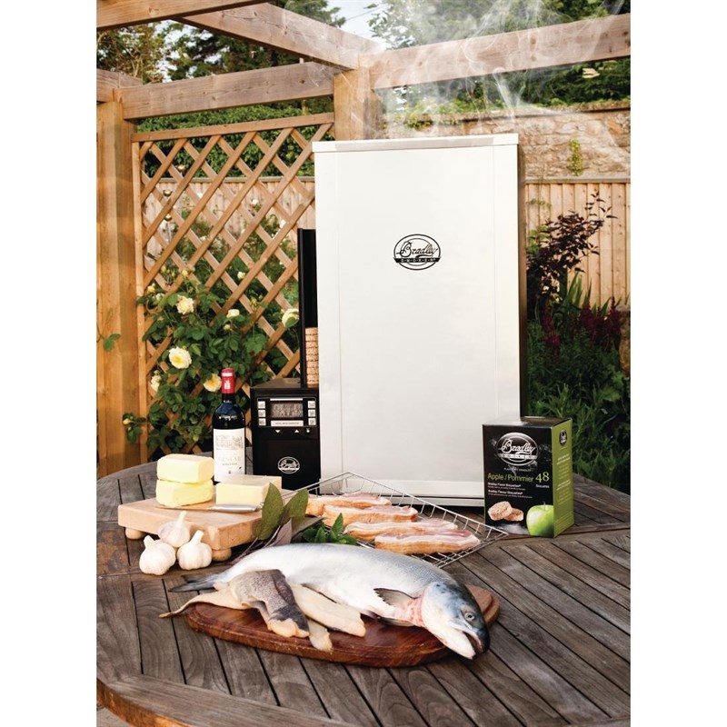 The Bradley 6 Rack Electric Digital Food Smoker BTDS108CE is used widely by gourmet and professional chefs for hot and cold smoking. From best-selling smoking brand Bradley, this original electric digital food smoker is easily ventilated and portable for outdoor use. Made from powder epoxy coated steel and with an aluminium interior, the machine features temperature monitoring control for even smoking and contains six shelves. Do not operate in an enclosed area.